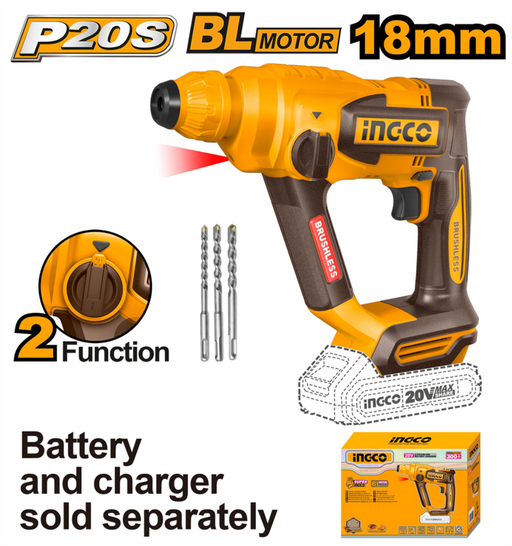 Brite LightingOnly 9 left!20V Cordless Rotary Hammer – Brushless MotorVoltage: 20VNo-Load Speed: 0–930 rpmImpact Rate: 0–4400 bpmImpact Energy: 4.5JChuck Type: SDS PlusInteg...