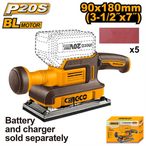 Brite LightingOnly 8 left!Brushless motorVoltage: 20VBottom base: 90 mm x 180 mmNo-load speed: 13 000 rpmAluminium durable baseIncludes:5 Piece sand paper
