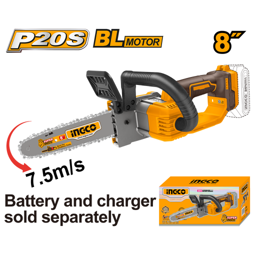 Brite LightingOnly 8 left!Voltage: 20VBar length: 8" (20 cm)Chain speed: 7.5 m/sBattery and charger sold separately.Includes:1 Piece wrench1 Piece oil bottle (empty)