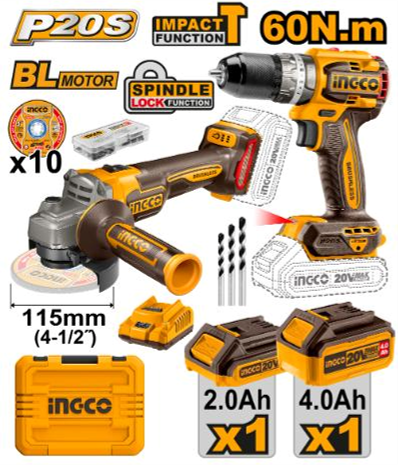 Brite Lightingin stockVoltage: 20VIncludes:1 Piece Lithium-Ion angle grinder (CAGLI21154)1 Piece Lithium-Ion compact brushless cordless drill (CIDLI20602)Lithium-Ion ang...