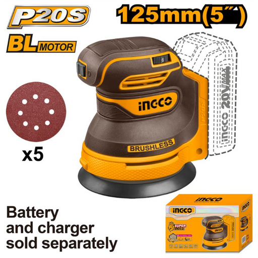 Brite LightingOnly 5 left!Voltage: 20VNo-load speed: 8 000 - 13 000 rpmBottom size: 125 mm (5'')5 Piece sand paperBattery and charger sold separately