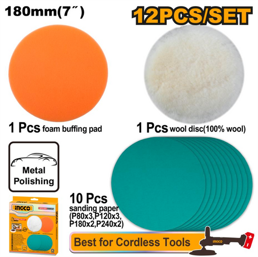 Brite LightingOnly 4 left!12 Piece/setDiameter: 180 mm (7")Suitable for APLI2018Includes:1 Piece wool disc (100% wool)1 Piece foam buffing pad10 Piece sanding paper (P80 x 3...